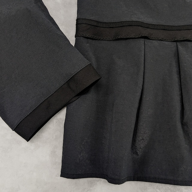 襟元のすっきり感とフリルのやわらかなニュアンスが合わさった、